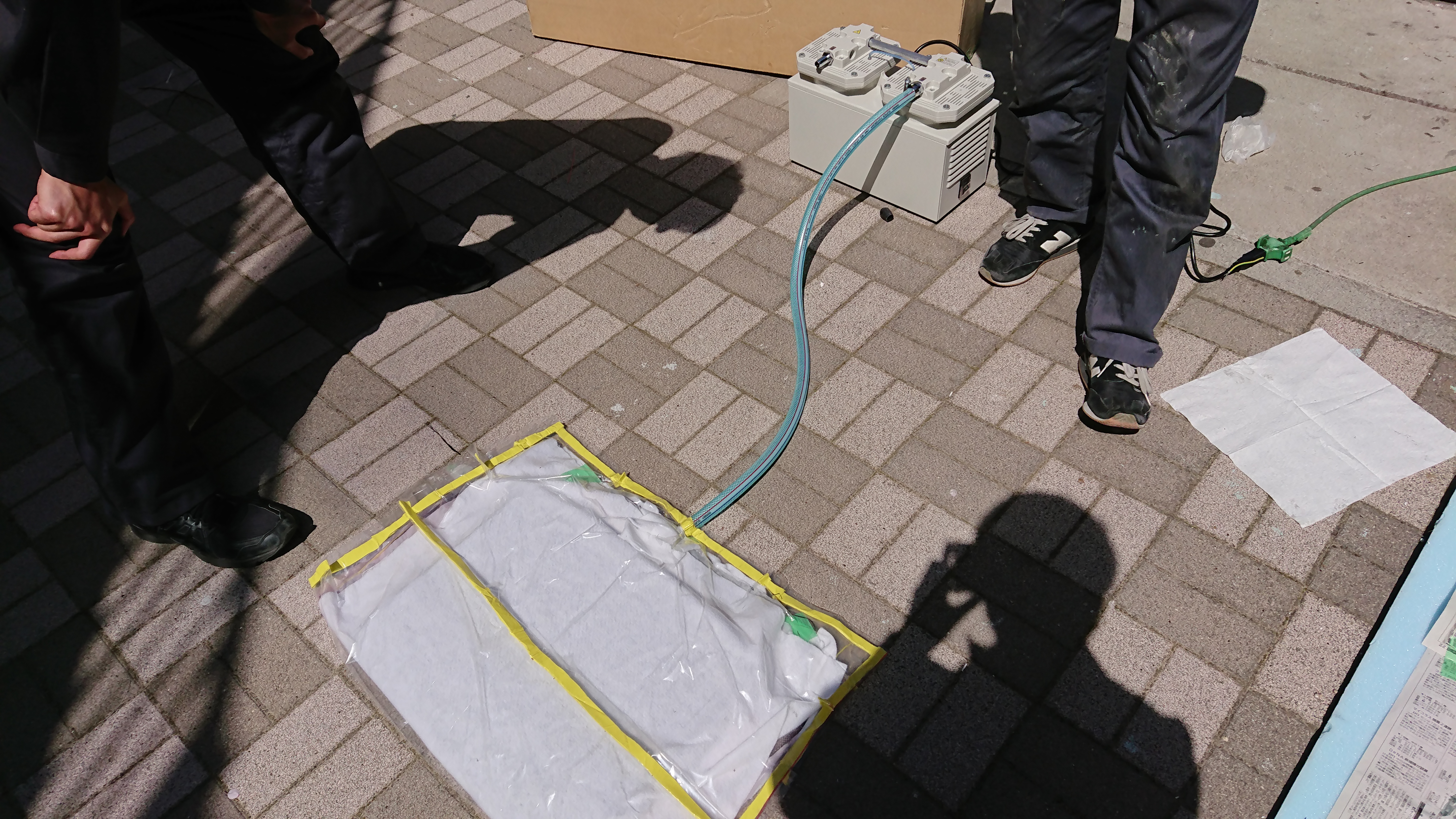 カーボンクロスや型、その他の副資材の準備が済んだらいよいよ積層工程に移ります。3枚目の写真はフロントウィングの一部の積層風景です。真空バックの中に型とプラスチック樹脂を含侵させたカーボンクロスを入れ、空気を抜いて大気圧で加圧します。真空バッグ法とか呼ばれている方式ですね。
