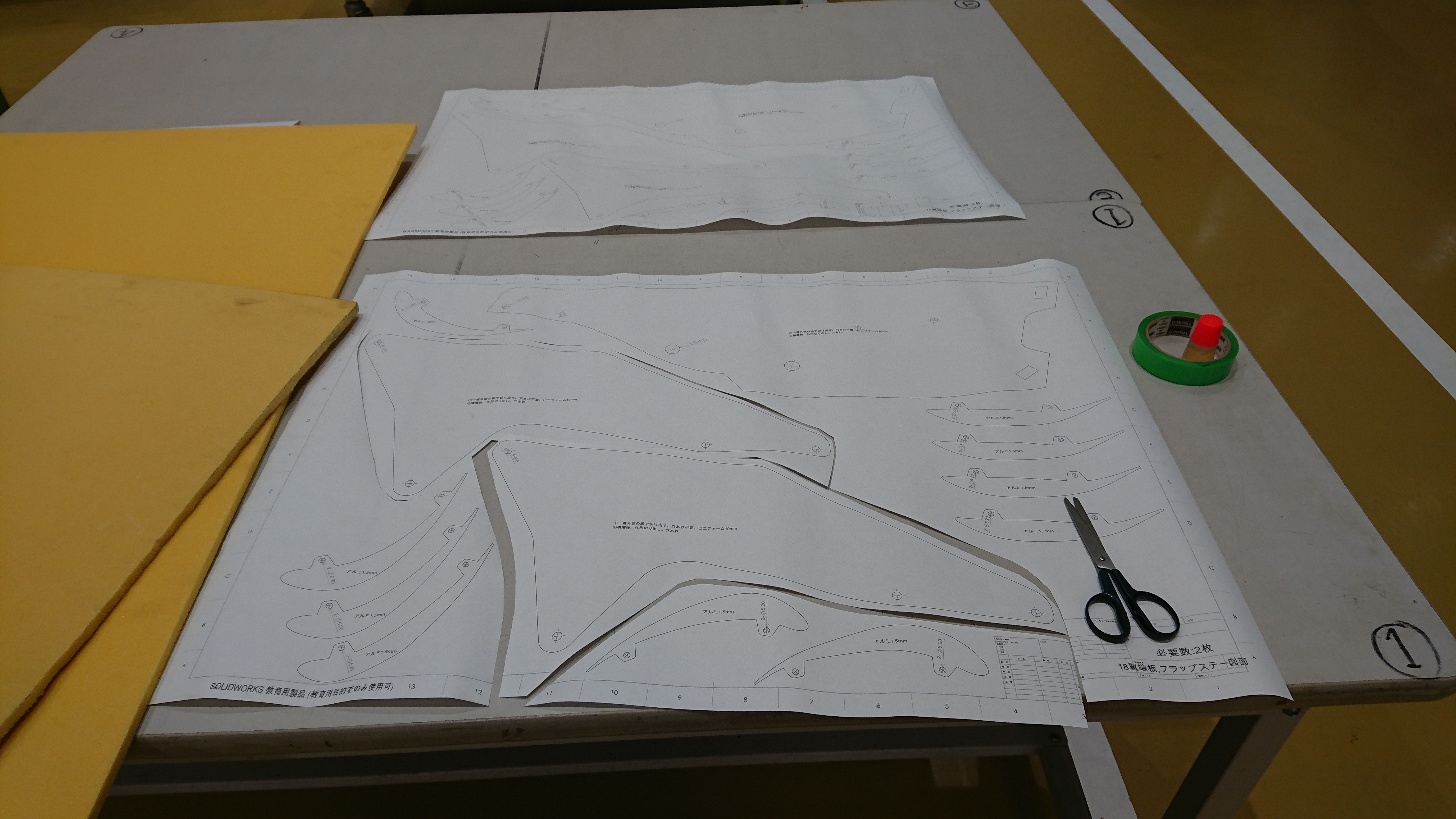 カーボンクロスの切り出しと平行して型を製作します。2枚目の写真は型の切り出しを行う様子です。左側にある黄色い板が型の材料です。型紙を張り付けこれに従ってカッティングを行い、型の完成です。