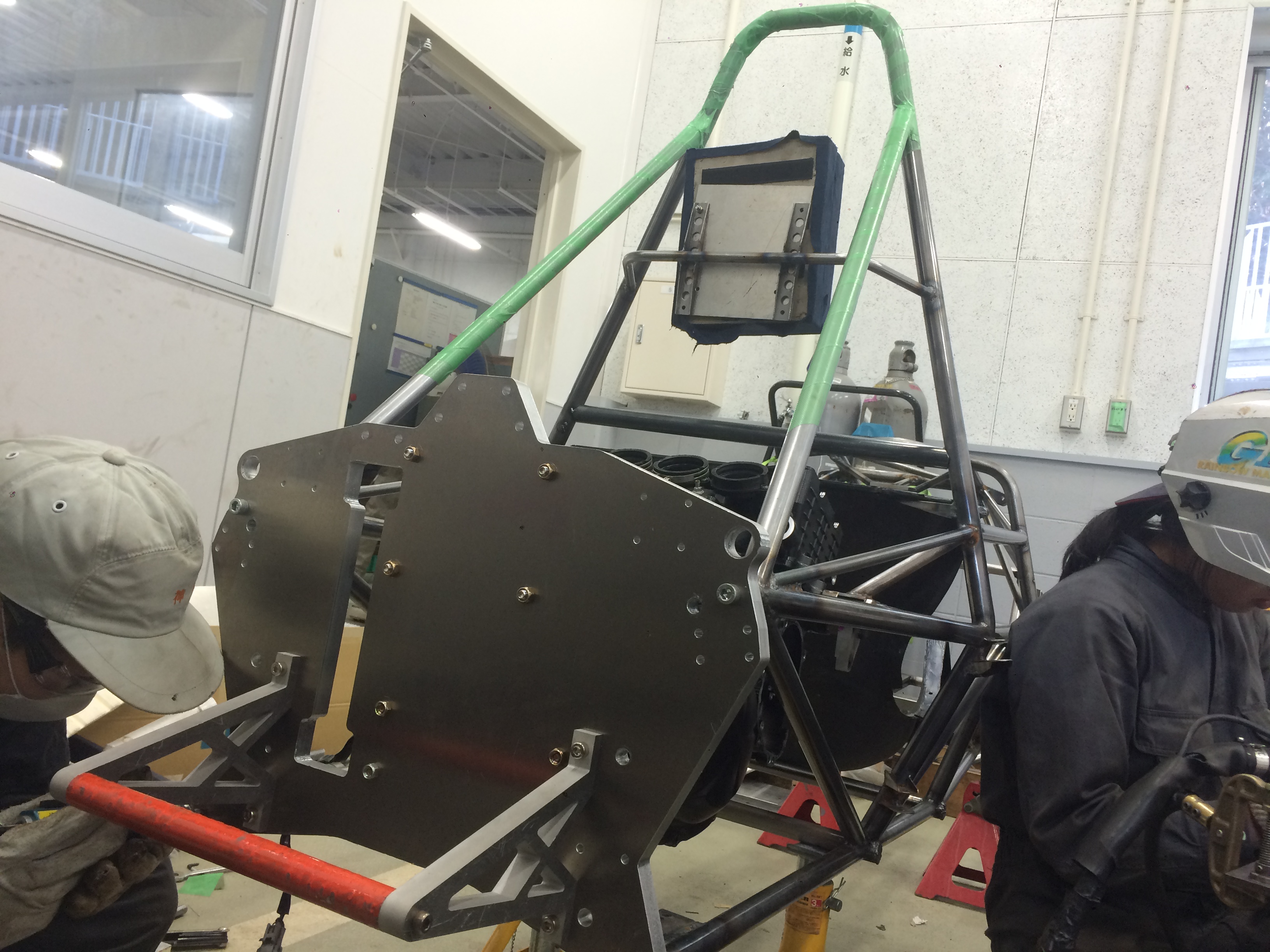 去年は製作時間の少なさ、製作精度の低さからくる再製作が多かったのですが今年はそういったミス比較的少なく、また、我々の車両の目玉でもあるリアバルクヘッドが肉抜きまではまだ行えてないものの、車両についた状態での自立です。